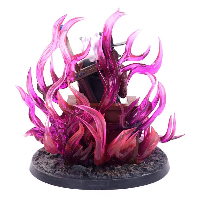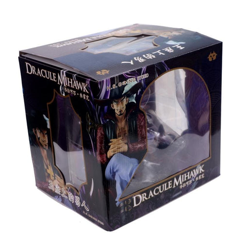 • Puissante statuette One Piece de 25 cm de Dracule Mihawk et son Kokuto Yoru assis sur un siège entouré de flammes roses