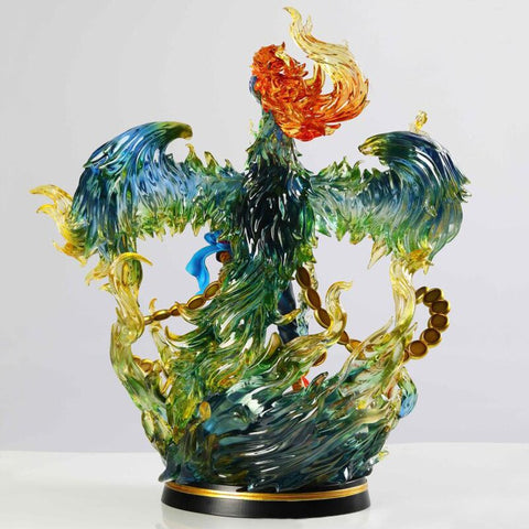 Sublime statuette One Piece de 25 cm de Marco le Phénix entouré de flammes bleues et jaunes et déployant ses ailes de Phénix