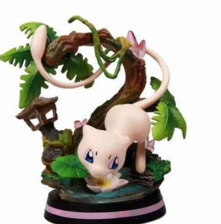 • Adorable figurine Pokémon de 14 cm du légendaire Mew flottant dans une forêt japonaise avec un arbre, une petite maison et une jolie  rivière